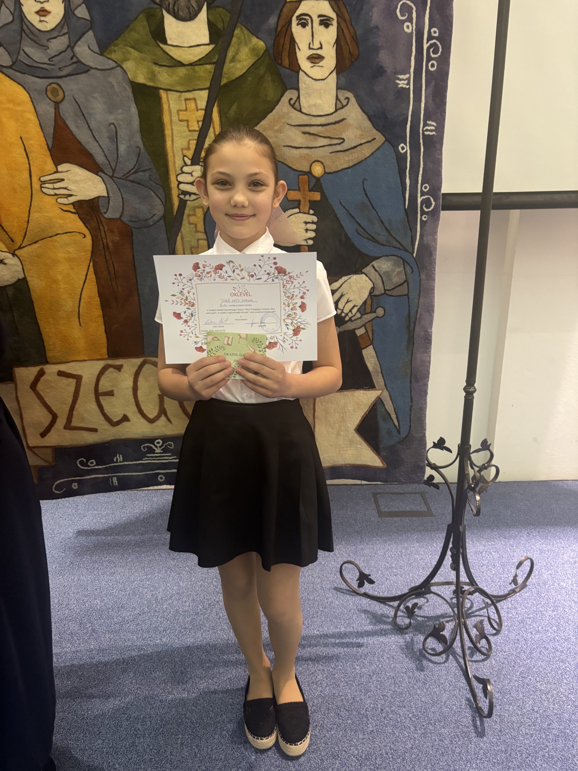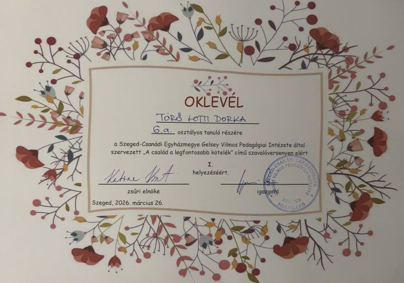 A Szeged-Csanádi Egyházmegye Gelsey Vilmos Pedagógiai Intézete által meghirdetett “A család a legfontosabb kötelék” című szavalóversenyen iskolánk 2 tanulója vett részt.