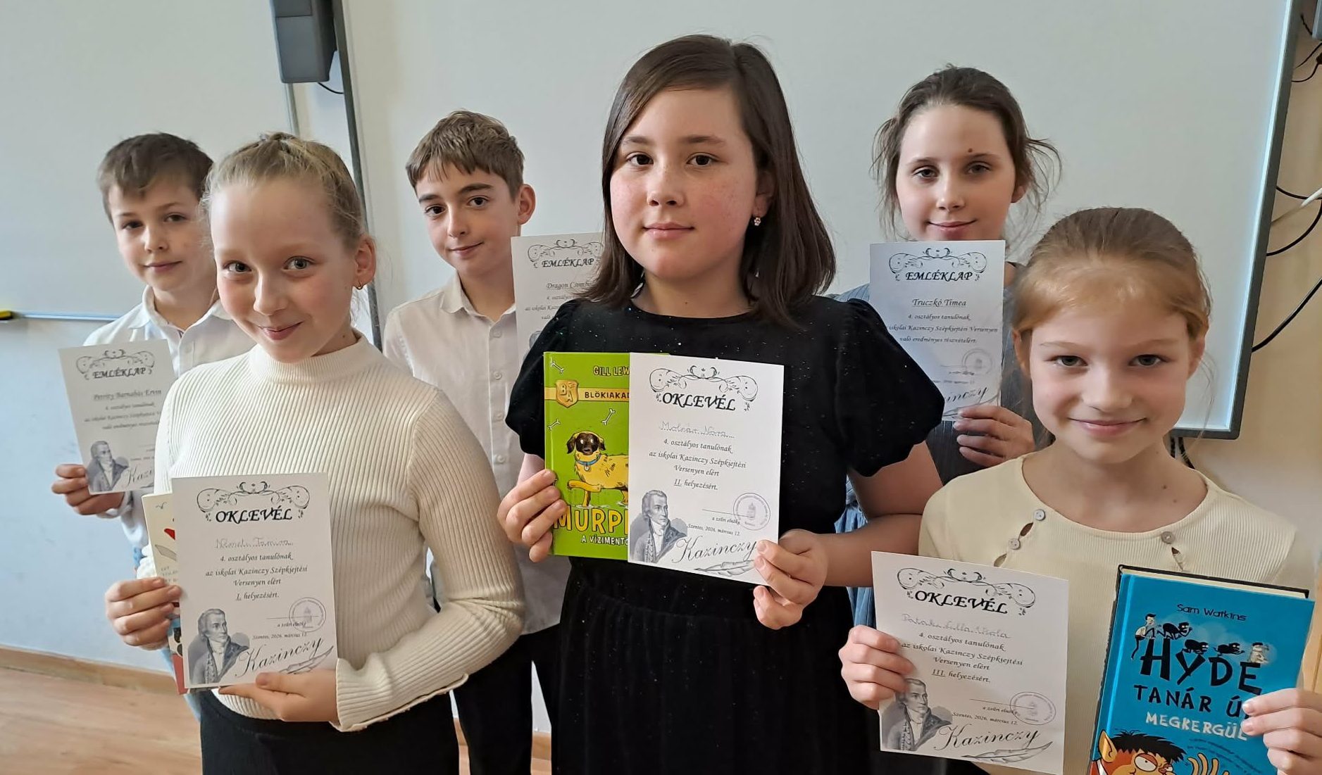 Iskolánkban 2026. 03. 12-én rendeztük meg a Kazinczy szépkiejtési versenyt a 3-4. osztályosok körében. A megmérettetésen, ahol a jó olvasás mellett a szép beszéd is egyaránt fontos volt, a következő eredmények születtek: